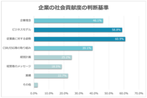 次に、企業の社会貢献をどこで判断しているかという問いでは、60.9%が「従業員に対する姿勢」で最多回答になり、次いで「ビジネスモデル」58.8%、「企業理念」46.1%という回答結果になりました。